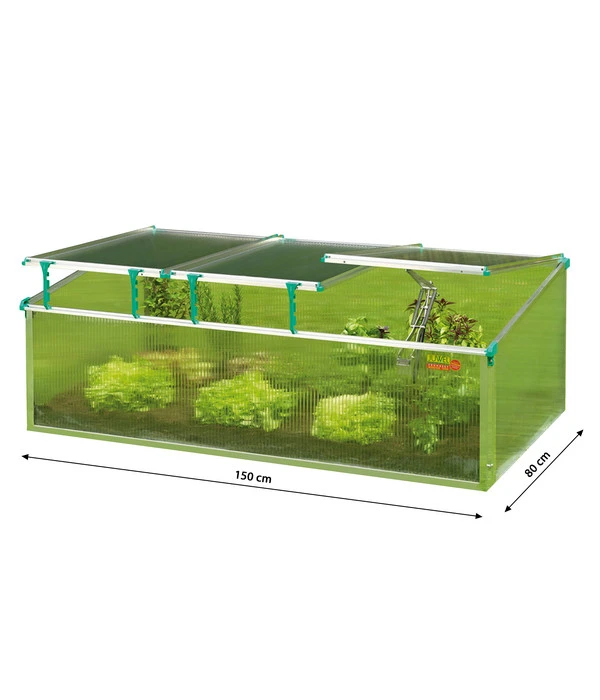 Neben dem automatischen Fensteröffner ist das Juwel Frühbeet Biostar 1500 außerdem mit einer speziellen No-Drip-Beschichtung an den transparenten Hohlkammerplatten ausgestattet, die verhindert, dass sich Kondens- und Tropfwasser bildet, das Ihren sensiblen Pflanzen schaden kann. Außerdem verfügt das Juwel Frühbeet Biostar 1500 mit Fensteröffner über eine besonders praktische Nutzhöhe und hat eine stattliche Grundfläche von 150 x 80 cm. Die Höhe von 40 cm vorne und 50 cm an der hinteren Kante erleichtert Ihnen die Pflege der Pflanzen sehr.
