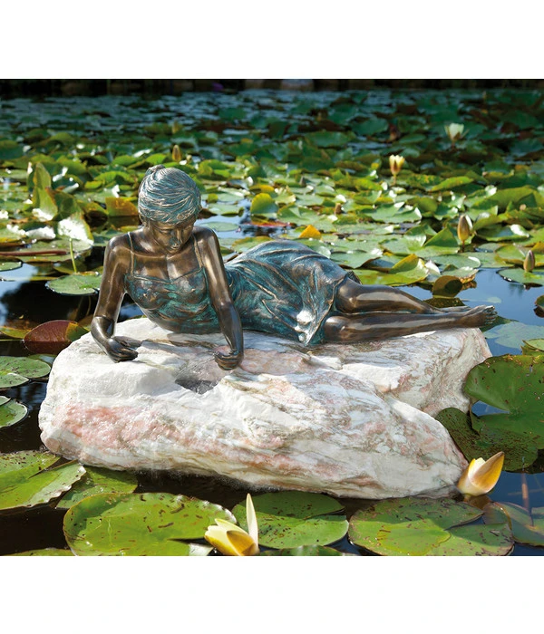 Ein reizender Anblick, wie das Mädchen Klementine ganz entspannt am Teich liegt und gedankenverloren das Wasser aus ihrer Hand in den Teich fließen lässt! Die Rottenecker Bronzefigur Mädchen Klementine erfreut mit ihrer Anmut das Auge des Betrachters, die träumerische Versunkenheit in den Anblick des Wassers unterstreicht die friedliche Stimmung am Gartenteich. Das leise Plätschern des Wassers schließlich wirkt wunderbar beruhigend und macht Ihren Teich zur Wellnessoase. Mit Liebe zum Detail von Künstlerhand entworfen und nach alter Handwerkskunst produziert, ist die Rottenecker Bronzefigur Mädchen Klementine ein Kunstwerk der höchsten Qualitätsstufe, das Ihren Garten auf einzigartige Weise bereichern wird!
