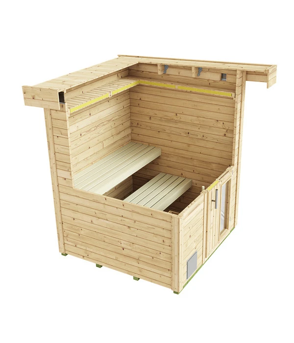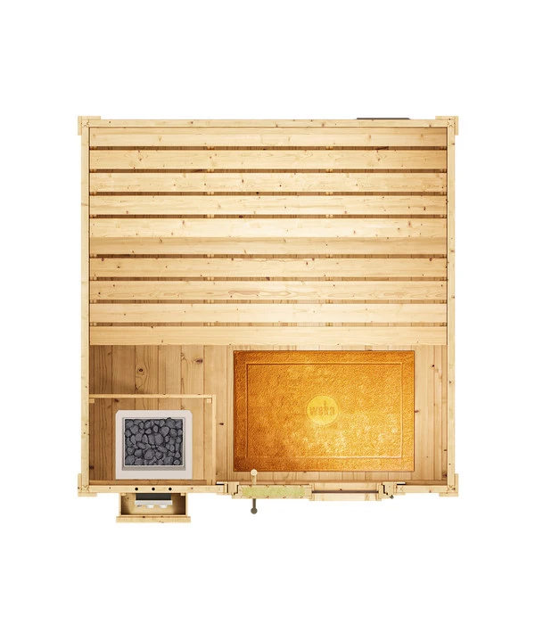 Die Wände und die Decke bestehen beim Weka Saunahaus Naantali aus 38 mm starken, naturbelassenen Fichtenholzbohlen aus dem Norden Europas. Denn dieses langsam gewachsene Holz verfügt über eine besondere Dichte und eine ausgezeichnete Wärmespeicherfähigkeit, sodass es die Wärme auch nur langsam abgibt. Und die holzeigenen Harze und ätherischen Öle verbreiten das würzige Holz-Aroma, das Teil der Saunaerlebnisses ist. Die Doppelnut- und -feder-Verbindungen garantieren beste Stabilität, Dichte und Lebensdauer und ermöglichen zugleich einen einfachen Aufbau.