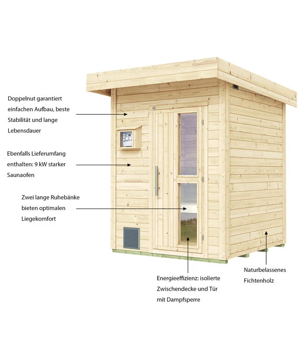 Der Trend “Saunieren im Garten“ begeistert immer mehr Menschen, denn es ist ein einzigartiges Erlebnis, beim gesunden Schwitzen in einen schön angelegten Garten blicken zu können, zur Abkühlung vielleicht in den Pool zu springen oder sich im Winter im Schnee zu wälzen und dann in eine dicke Decke gewickelt im Liegestuhl unter freiem Himmel zu entspannen, bevor Sie beim nächsten Saunagang wieder Hitze tanken. Und schließlich ist eine Gartensauna wie das Weka Saunahaus Naantali, das ganz aus naturbelassenem Holz gefertigt wurde, auch ein attraktiver Blickfang im Garten. Im Inneren warten zwei Liegen darauf, dass Sie allein oder zu zweit darauf Platz nehmen und der 9 kW starke Saunaofen, der im Angebot inbegriffen ist, kann Ihnen richtig einheizen. Lassen Sie sich von dem Weka Saunahaus Naantali ruhig mehr als einmal in der Woche zum gesunden Schwitzen verführen – nichts ist so entspannend für Körper und Seele.